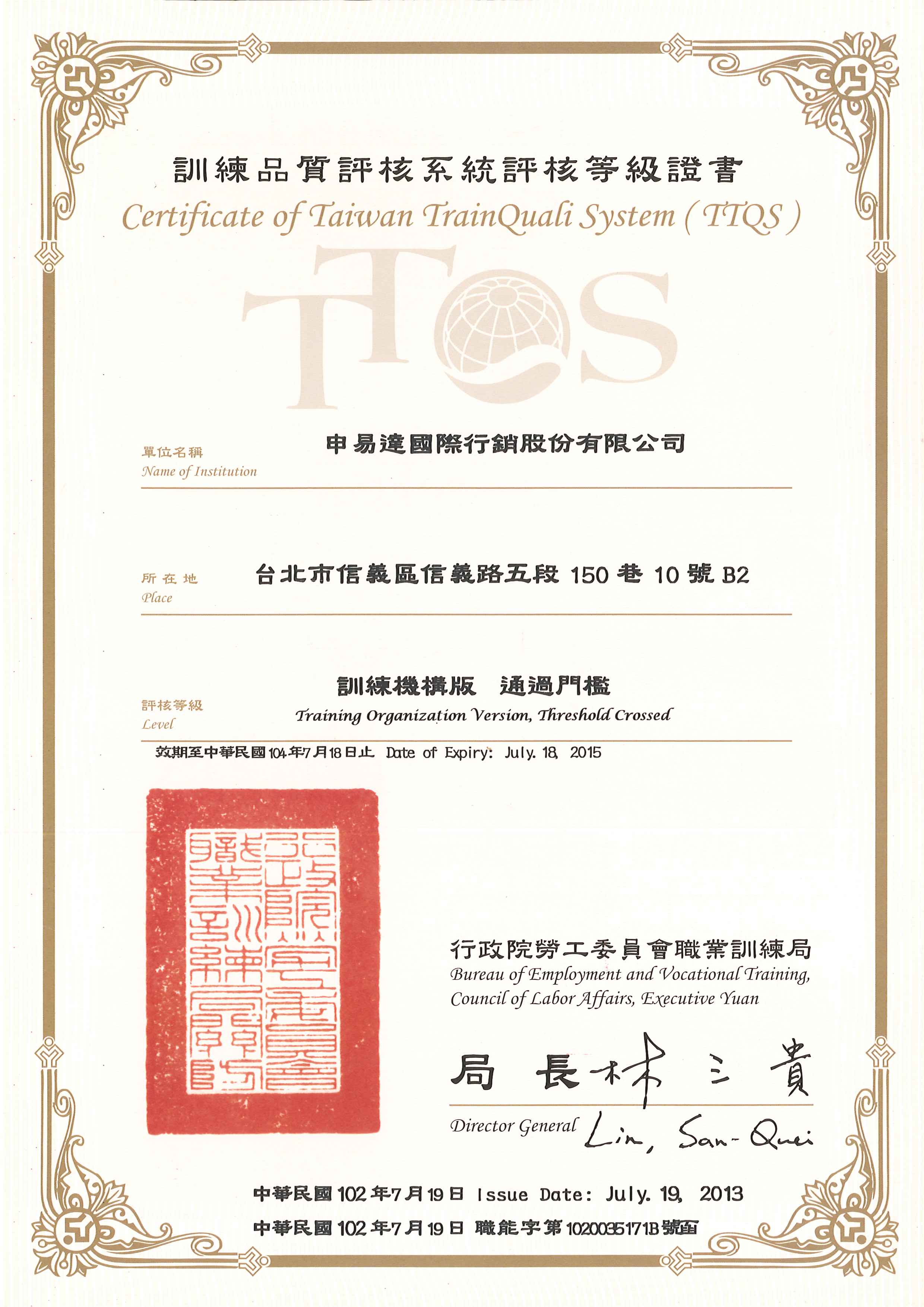 行政院勞委會TTQS證書