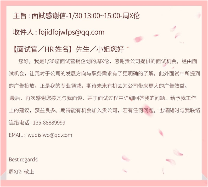 建议感谢信的篇幅不要超过 1 页,讲重点即可。只要记得在撰写感谢信时,真诚表达你的求职优势,并于最后附上联络方式,让人资更方便联络你。如果这封感谢函能确实响应公司的需求,相信你很快就会收到录取通知了!
