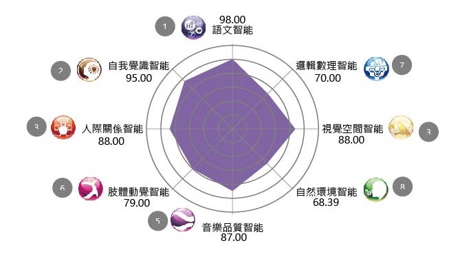八大原智測評中有8個智能分別是:語文智能、邏輯數理智能、視覺空間智能、自然環境智能、音品智能、肢體動覺智能、人際關係智能、自我覺識智能。